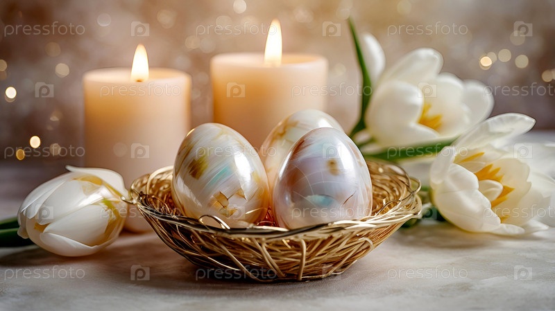 Нежные пасхальные яйца в жемчужной корзине и нежные цветы на пастельно-водном фоне