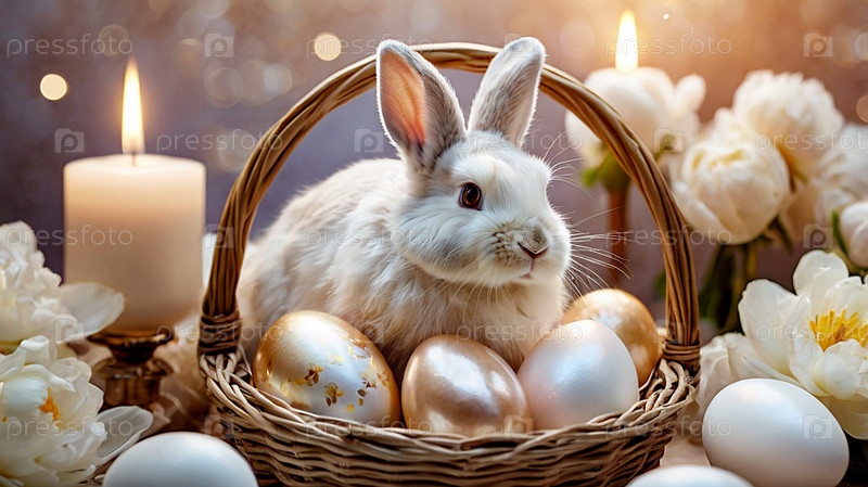 Нежные пасхальные жемчужинные яйца в корзине, кролик и нежные цветы на пастельном аквареле