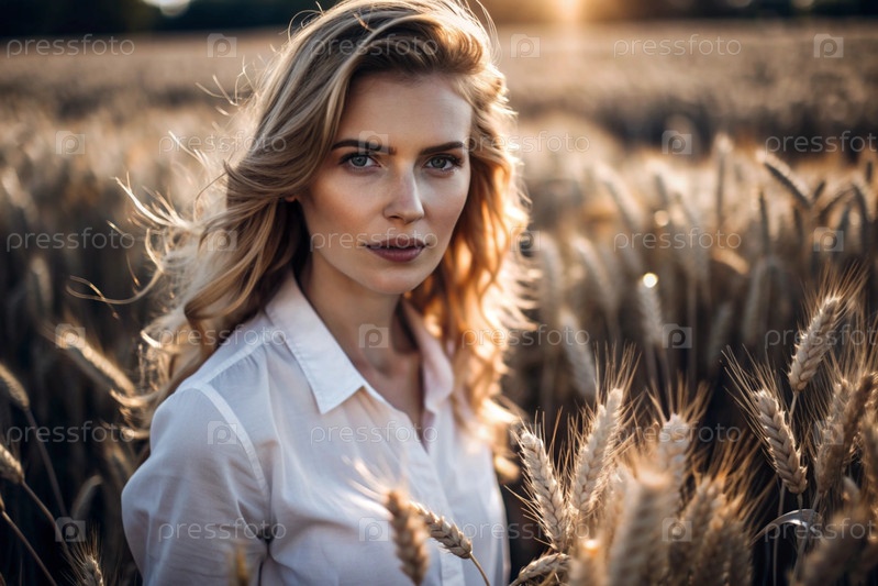 Молодая девушка в белой рубашке с золотыми волосами стоит на поле спелой золотистой пшеницы при закате солнца.Урожай, сельская природа и жизнь