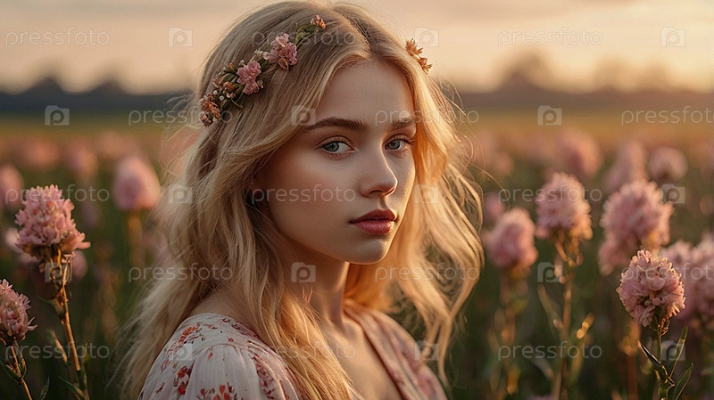 Теплый портрет красивой кудрявой женщины на цветущем поле при закате солнца. Романтическая, спокойная и чувственная фотография девушки в деликатном платье