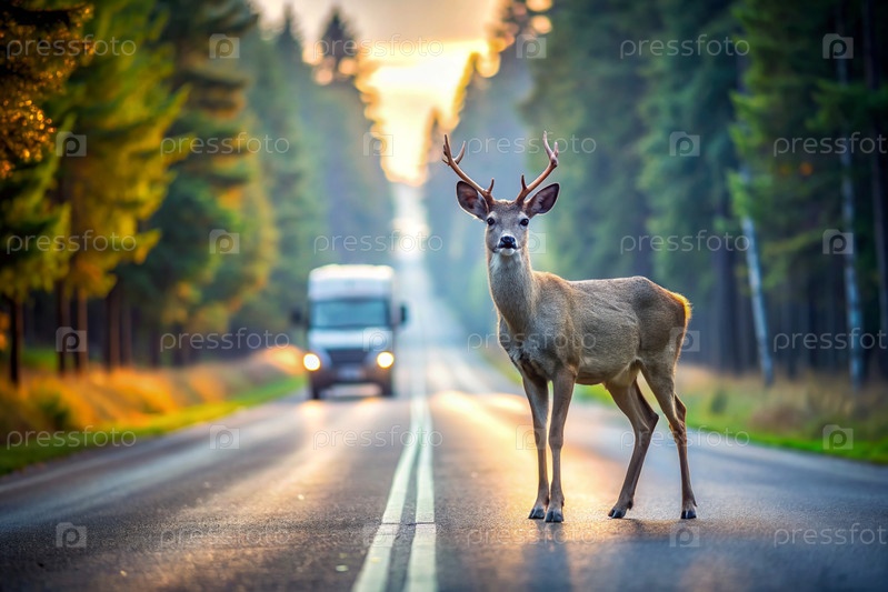 ДТП.Животное - это олень на дороге возле леса рано утром.Дорожные опасности, дикая природа и транспортное средство