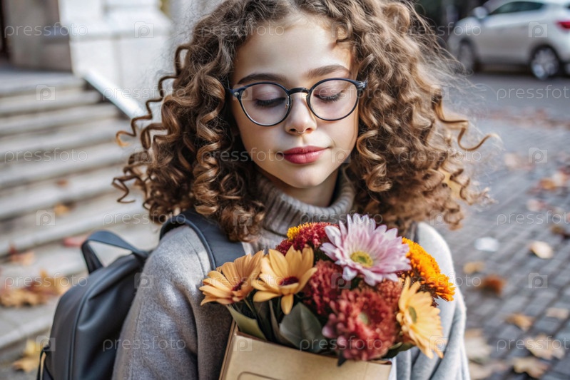Красивая маленькая кудрявая девочка в очках и букете осенних цветов ходит в школу впервые. Ребенок со школьной сумкой, книгой и цветами. Малыш на городской улице. Возвращение к школе