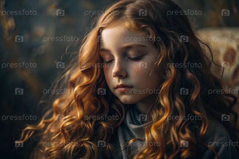 Портрет красивой маленькой рыжеволосой девочки с длинными волнистыми волосами и задумчивым взглядом.Власы развиваются и создают ощущение легкости и естественности