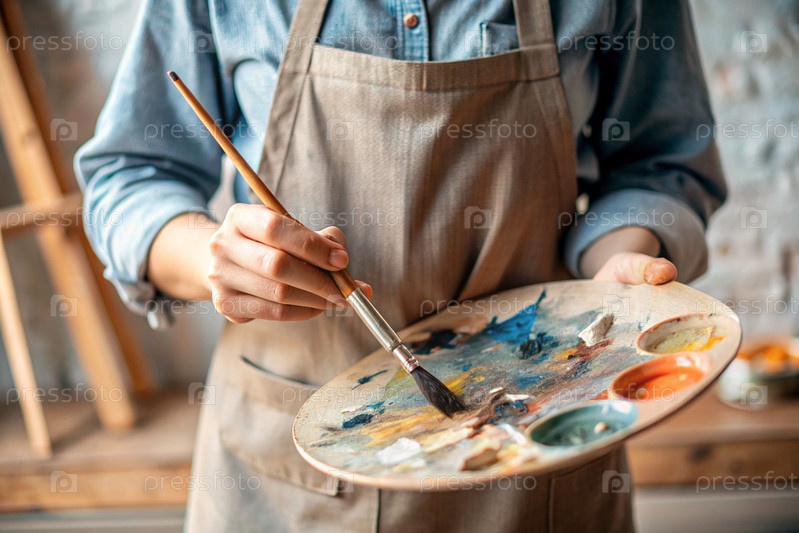 Близко. Понятие творческой деятельности. Художник в мастерской с маслом и кистью в руках. Искусство, креативность и отдых