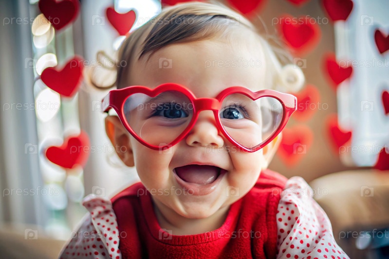 Милая девочка в стильных красных очках в форме сердца проводит веселый День святого Валентина