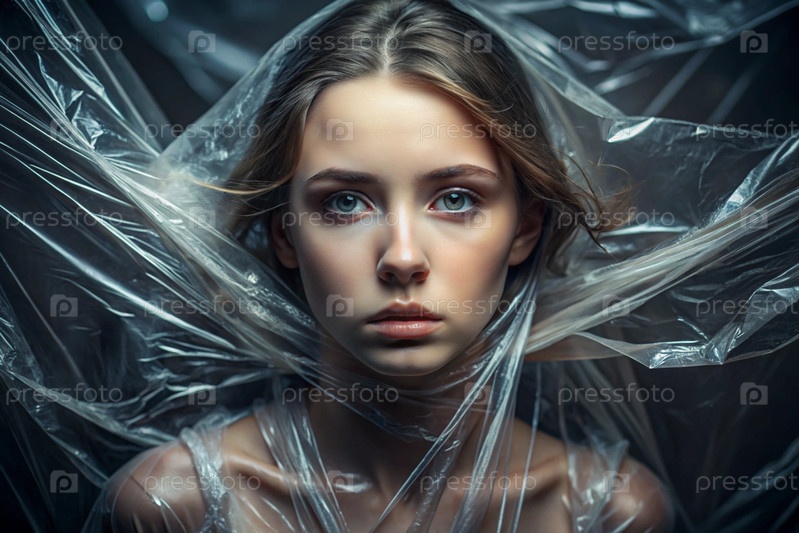 Девочка завернута в целлофан или сумку. Девушка задыхается. Пластиковое загрязнение планеты. Опасность для окружающей среды. Сокращение повторного использования пластика. Переработка. Концепция мусора