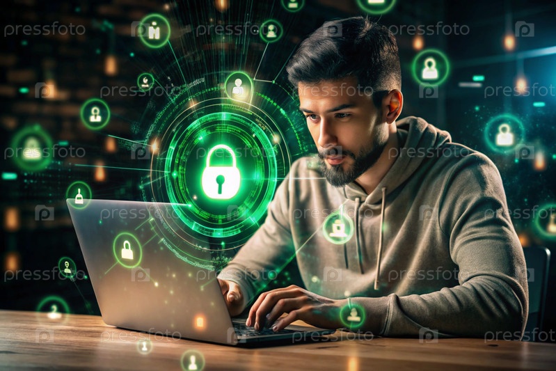 Хакер работает на ноутбуке, цифровые коды на виртуальном фоне. взлом и защита онлайн-данных. цифровые технологии, разработка программного обеспечения