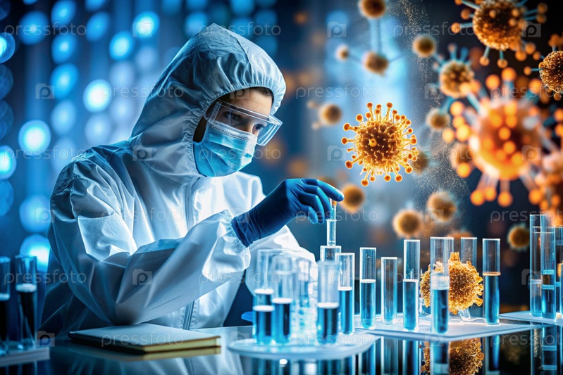 Ученый в лабораторном пальто и защитной маске осматривает трубки с светящимся вирусом в лаборатории, что символизирует продолжающуюся борьбу с инфекционными заболеваниями, важность исследований и изобретений вакцин