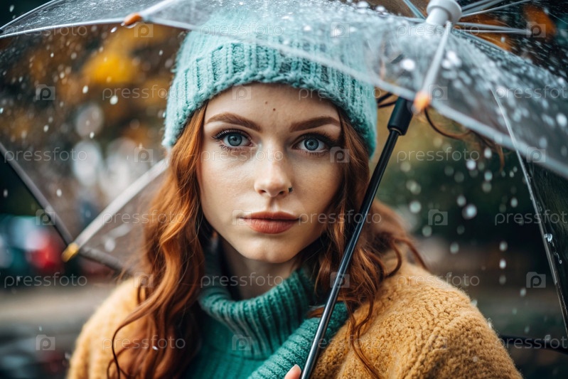 Осенний портрет под дождем. Близкий план молодой рыжеволосой женщины с ярко выраженными зелеными глазами в вязанной шляпе под зонтиком