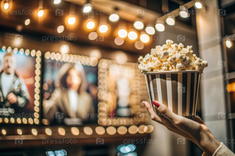 Красно-белый полосатый ящик с солеными попкорнами в руке на фоне светофоров кинотеатра