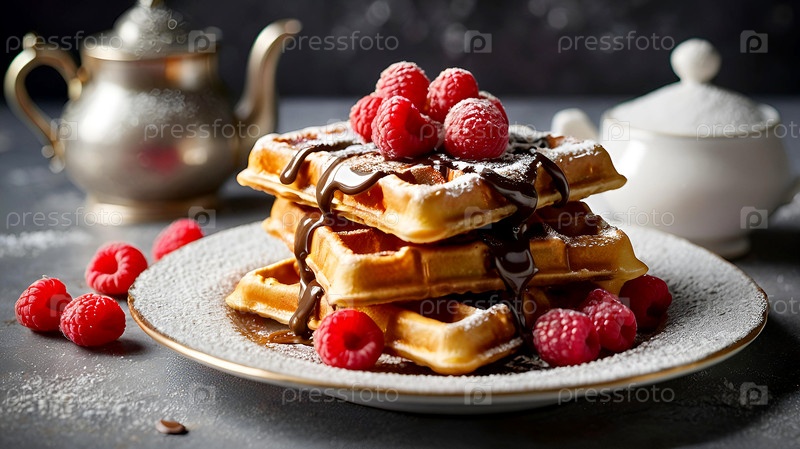 Свежевыпеченные бельгийские вафли украшены сахарным порошком, шоколадом и свежими ягодами