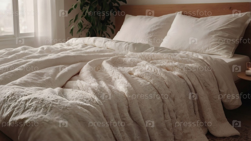 Интерьер современного дома.Минималистский уютный бежевый интерьер спальни с клеткой, подушками, головной доской, полотном и ночным столом