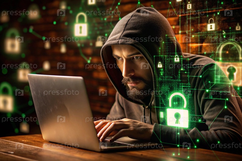 Хакер работает на ноутбуке, цифровые коды на виртуальном фоне. взлом и защита онлайн-данных. цифровые технологии, разработка программного обеспечения
