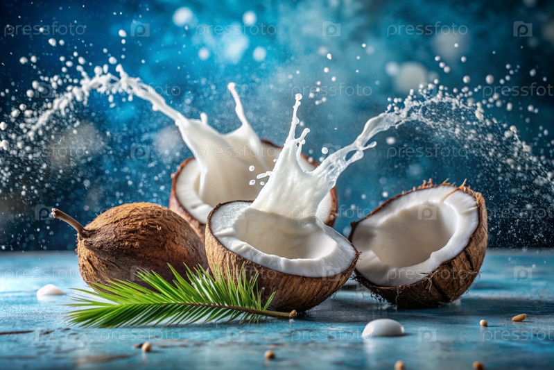 брызги кокосового молока и пальмовых листьев. Брызги молока - кокосы на синем фоне. Баннер для сладостей, курортной косметики или кремов по уходу за телом и лицом
