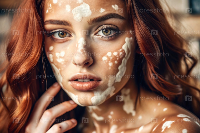Лейкодермия. Витилиго. Плохая пигментация кожи. Большие белые пятна по всему телу и лицу. Портрет красивой девушки с кожными заболеваниями