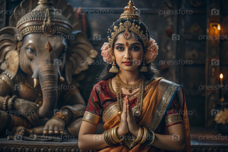 Красивая индийская девушка в традиционном национальном костюме, сари. со слонами. портрет символизирует традиции, культуру и красоту народа Индии