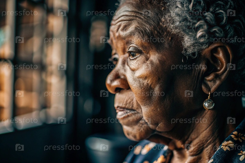 пожилая чернокожая афроамериканка с грустным лицом. старость, пенсия. проблемы людей старшего возраста. дома престарелых