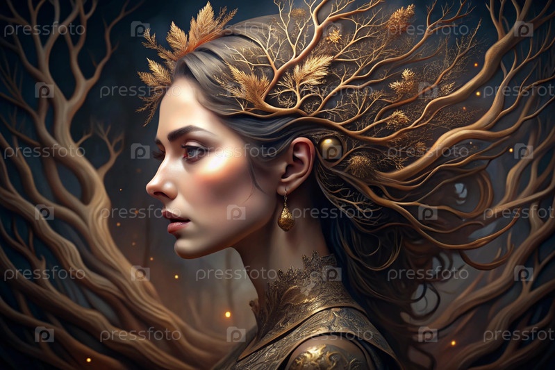 Творческий баннер для салона красоты в черно-золотом цвете. Красивая женщина, окруженная лесом с макияжем и волосами. Золотые ветви дерева в волосах. Индустрия красоты
