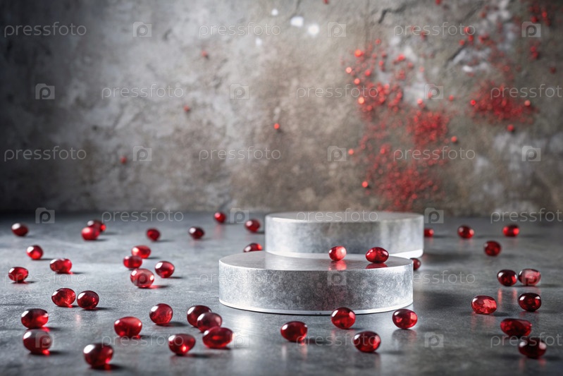Минималистский фон для выставки ювелирных изделий. Современный пустой подиум с серой стеной и рубинами. Креативный дизайн презентации продукта