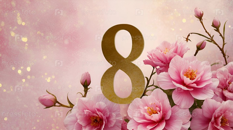 Международный женский день. праздник приходится на 8 марта. баннер, флаер. торжественный, нежный розовый цветочный фон с номером 8