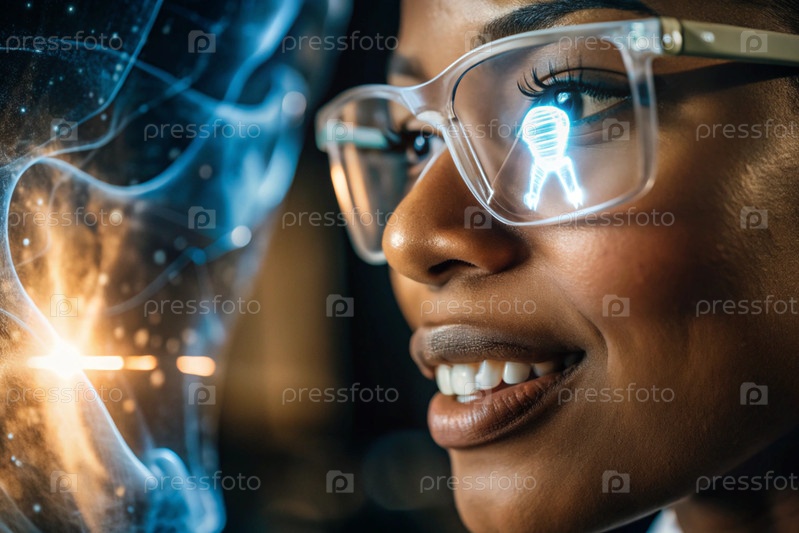 Новые технологии цифрового искусственного интеллекта в зубных протезах. Имплантаты. Чернокожая женщина-стоматолог с идеальной улыбкой и цифровой стоматологической графикой на виртуальном экране. Концепция здоровья зубов и ухода за зубами