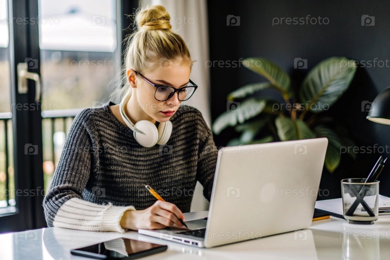 Молодая женщина фрилансер в очках и наушниках работает на ноутбуке или делает покупки в интернет-магазине