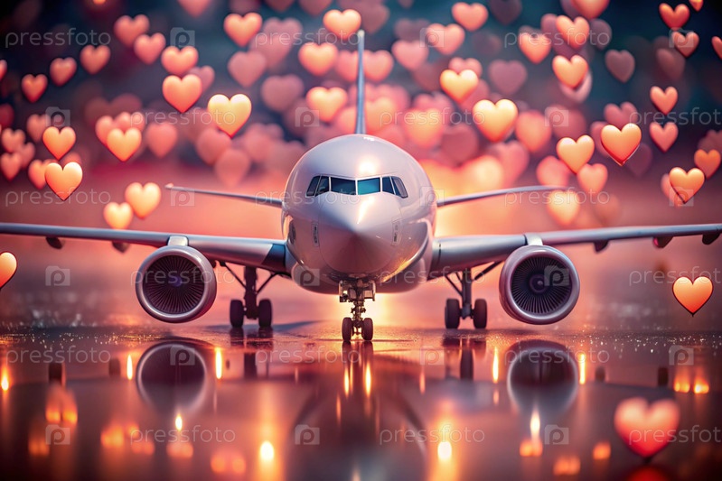 Любовное путешествие. Самолет и сердца вокруг. Подарок для любимого человека в День святого Валентина похож на романтическую поездку. Баннер с предложениями и акциями от туроператора
