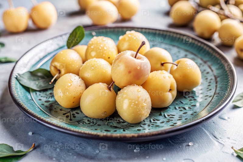 Закрытие свежих слив. Вкусные ягоды и фрукты ярко-желтого и фиолетового цвета с капельками воды. Вегетарианство. Здоровое питание. Свежие плоды на столе