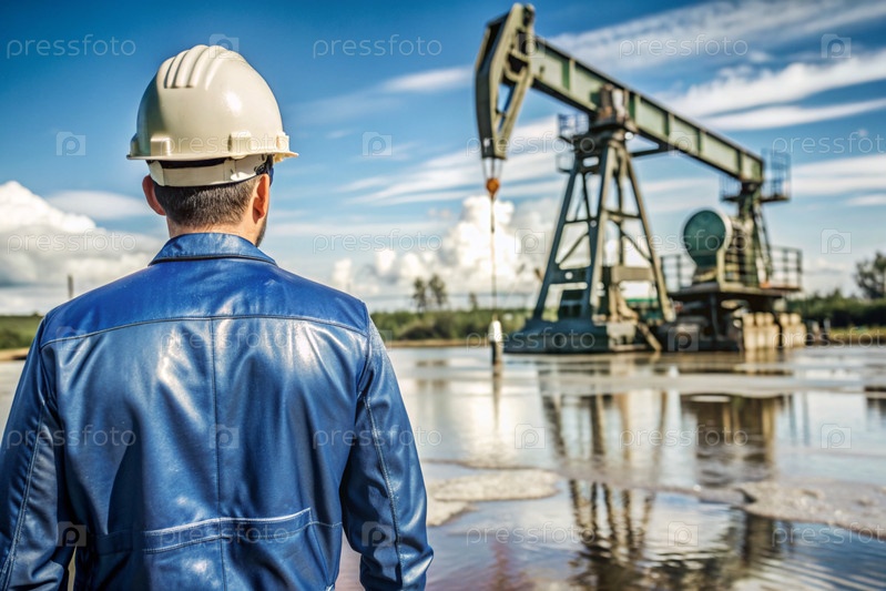 Добыча нефти. Нефтяные скважины и человек в рабочей одежде и строительном шлеме. Нефтяная платформа и промышленное оборудование. Тяжелые условия труда