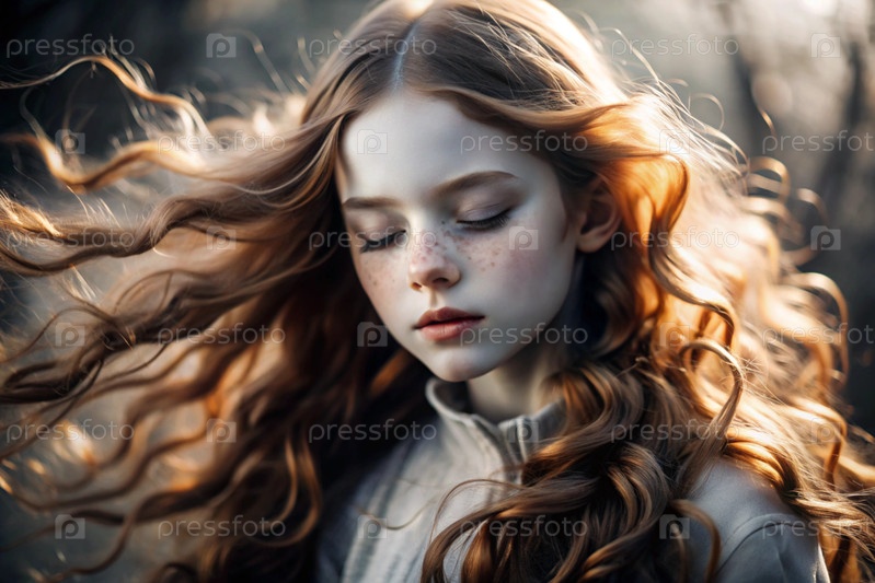 Портрет красивой маленькой рыжеволосой девочки с длинными волнистыми волосами и задумчивым взглядом.Власы развиваются и создают ощущение легкости и естественности