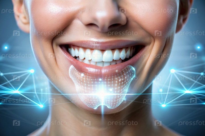 Новые технологии в протезировании зубов. Имплантаты. Улыбающаяся женщина со здоровой, идеальной улыбкой. Концепция стоматологического здоровья и ухода за зубами