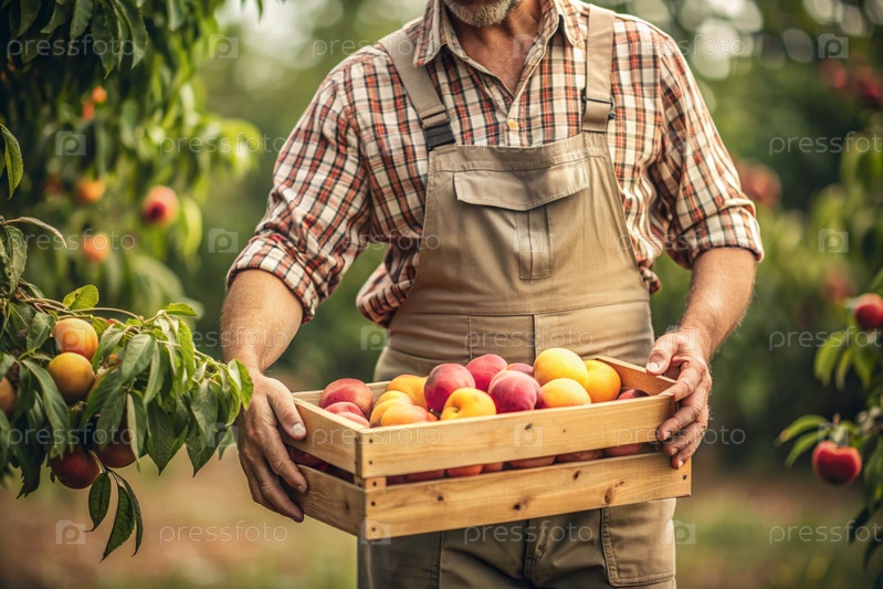 Сельскохозяйственная промышленность. Деревянный ящик с персиками в руках фермера-мужчины. Садовник собирает богатый урожай. Ближе, солнечный свет. Осенний урожай фруктов