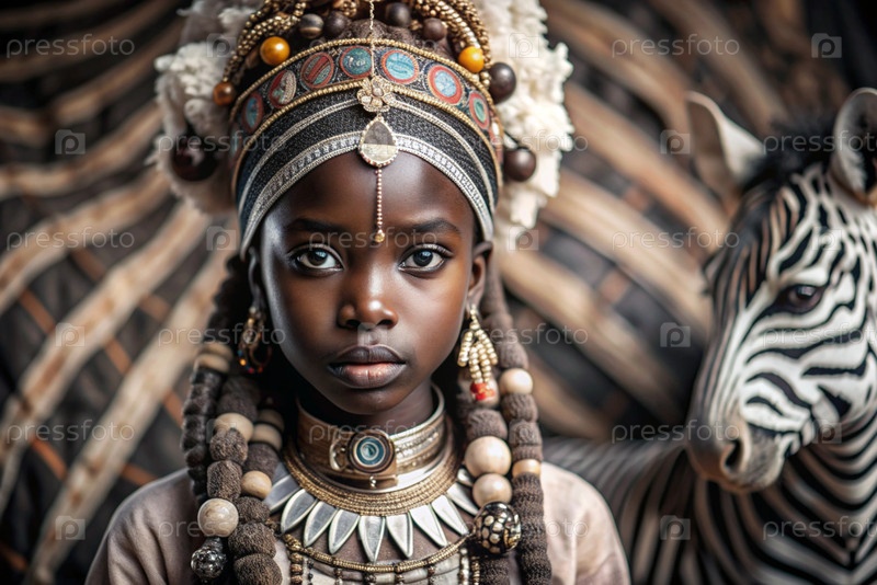 Красивая африканская девушка в традиционном национальном костюме против зебры портрет символизирует традиции и красоту африканского народа
