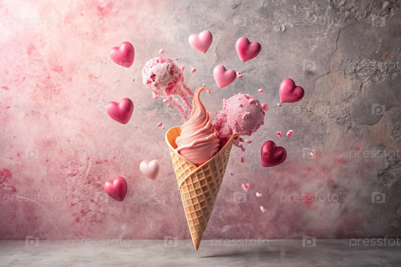 Сладкий десерт. Любовь к мороженому. Сердечно-образный конус мороженого с брызгами, сердцами и пятнами. Концепция Дня святого Валентина. Баннер, реклама