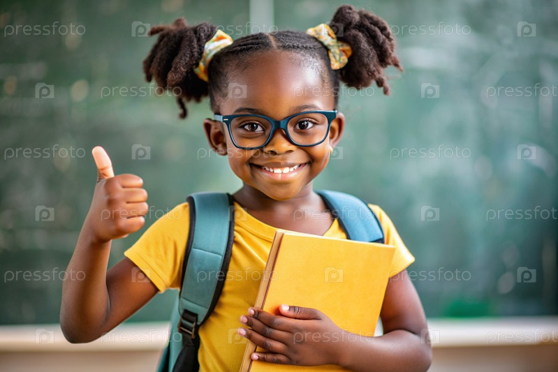 Милая чернокожая афроамериканка с очками показывает класс рукой. Ребенок впервые идет в школу. Ребёнок со школьной сумкой и книгой. Ребёнок в классе с доской. Возвращение к школе
