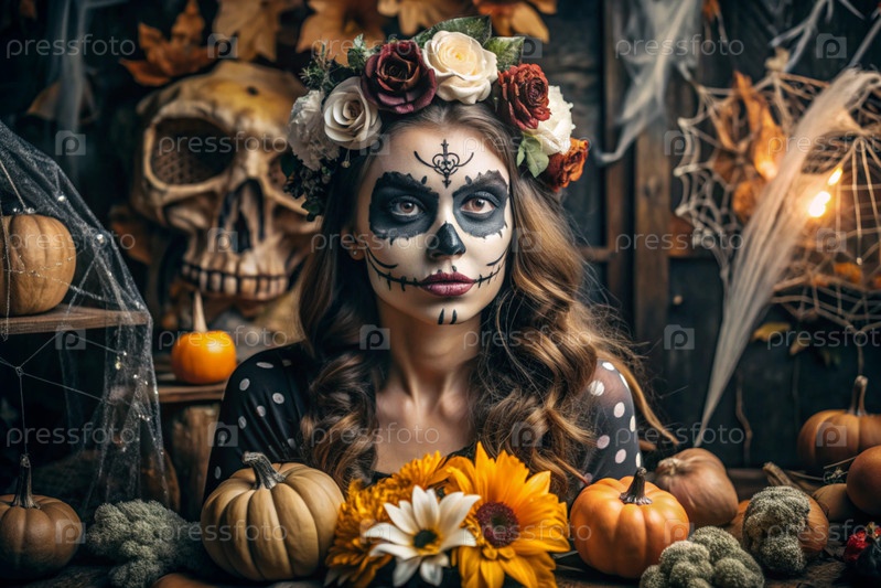 Концепция Хэллоуина. Ужасно. Костюмированная вечеринка. Красивая женщина с покрашенным черепом на лице и цветами на голове. Баннер, открытка