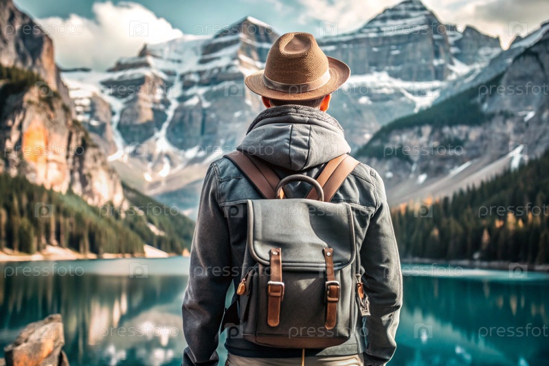 Человек с рюкзаком на спине против голубого озера в горном лесу. он путешествует и наслаждается жизнью и окружающей средой. туризм