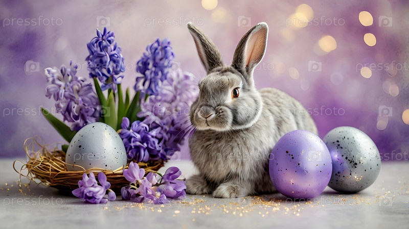 Нежные пасхальные яйца, серый кролик и фиолетовые цветы гиацинта на пастельном акварельном фоне с нежными венами