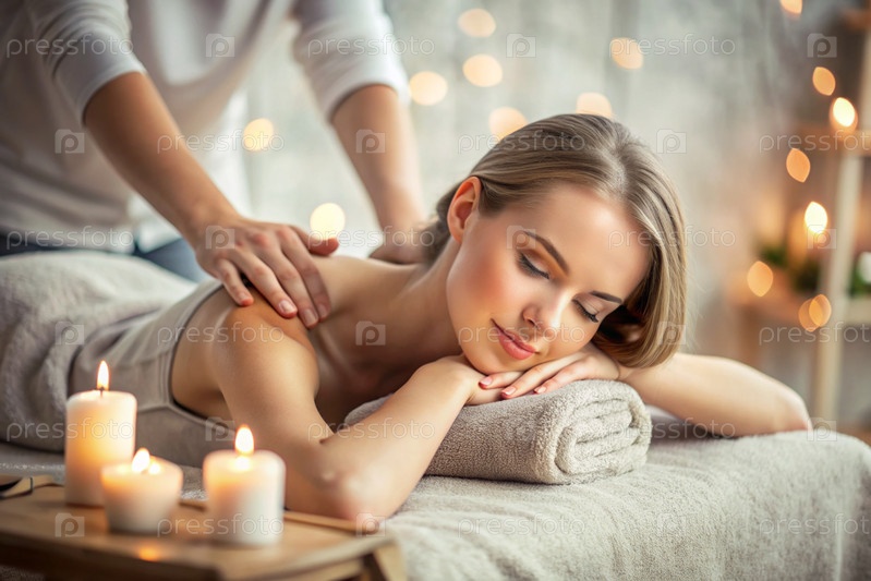 Баннер для профессиональных массажных салонов.Молодая, красивая блондинка наслаждается массажем в современном спа при свечах.Освобождение и гармония, уход за телом