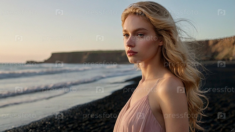 Портрет красивой женщины на пляже перед морем.Романтическая, спокойная и чувственная фотография девушки в проветренном нежном платье