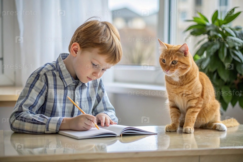Образование и обучение. Маленький мальчик делает домашнее задание. Ученик выполняет школьное дома. Рядом со мной сидит рыжеволосая кошка