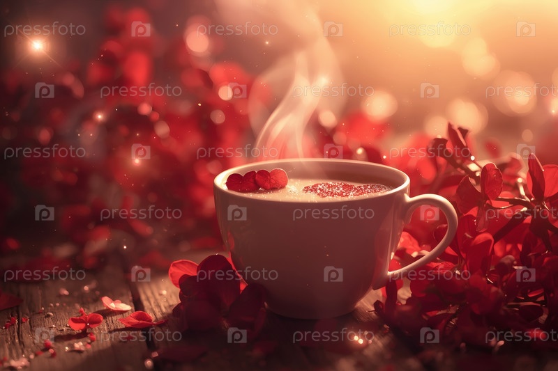 Чашка горячего кофе или чая, окруженная красными цветами и сердцами в День святого Валентина