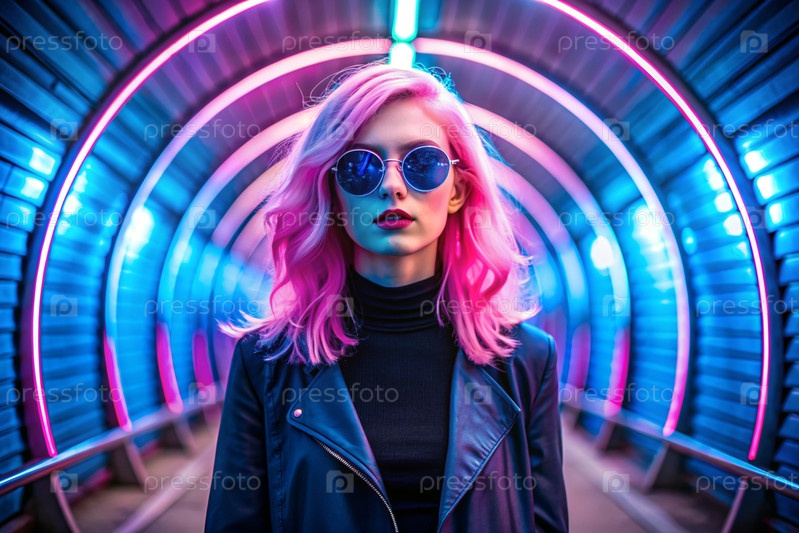 Молодая стильная красивая девушка в солнцезащитных очках стоит в неонном туннеле среди неоновых вывесок