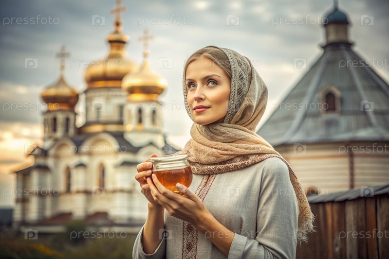 Концепция российского православного праздника 'Мёд Спаситель' Красивая девушка в русской национальной одежде и шарфе с баночкой меда на фоне православной церкви