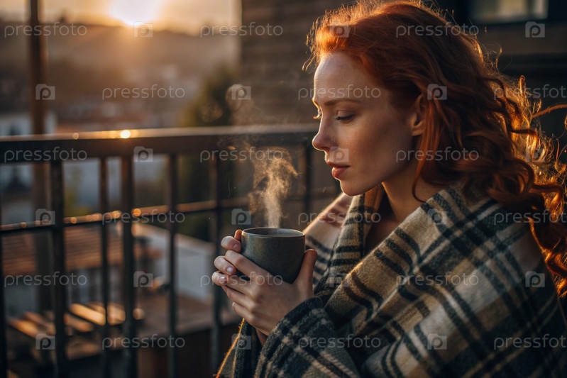 Красивая рыжеволосая женщина, завернутая в клетку с кружкой горячего кофе на красивом террасе под лучами заходящего солнца