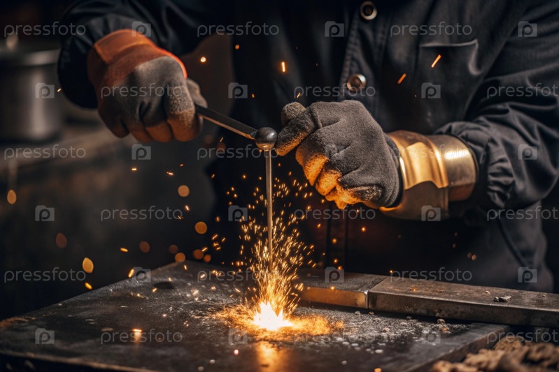 Работа на фабрике. Трудовые профессии. Мужские руки в металлических защитных перчатках. Вокруг искры. Тяжелая работа, требующая высокой концентрации и профессионализма