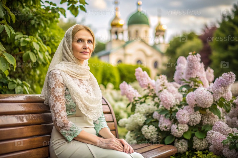 Красивая женщина в плато сидит на скамейке рядом с цветущим деревом перед православной церковью