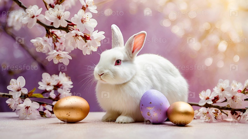 Нежные пасхальные яйца, белый кролик и вишневые ветви на фоне пастельного акварели с нежными полосками