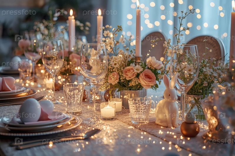 Пасхальный баннер 2026. декоративная тарелка, столовая посуда, стаканы, пасхальные яйца и кролики. концепция празднования Пасхи для кафе и ресторанов