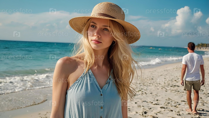 Летние каникулы на пляже, крупный план красивой женщины в соломенной шляпе.Лето. Праздники и праздники, место для копирования